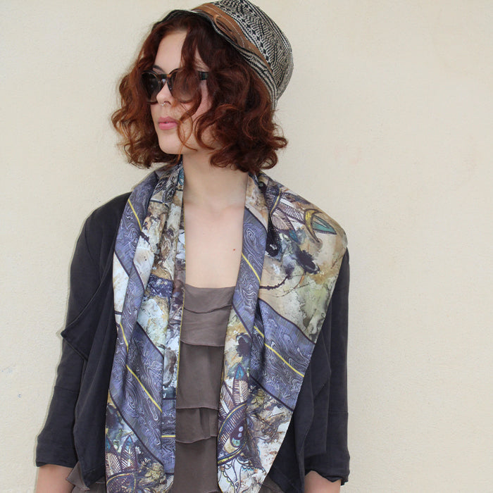 Foulard in seta Twill 80X80 bordato mano-macchina. Foulard "Tartaruga" pura seta, quadrato con stampa personalizzata. In tre varianti colore: Giallo-Lilla-Bianco. E' ideale da indossare attorno la collo o sulle spalle o legato il testa come turbante, per completare qualsiasi tipo di look. Made in Italy.
